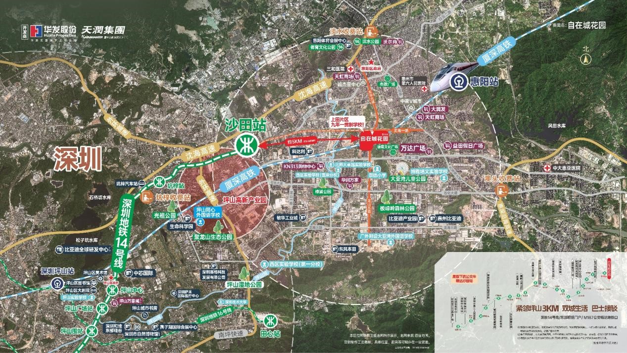 自在城花園距深圳約3公里(百度測距),一線臨深,家門口M187巴士暢達地鐵14號線沙田站。另有夏深高鐵一站抵深。加之深汕高鐵(建設(shè)中)、深大城際(建設(shè)中)4大高速、5條快速主干道,全維立體交通,直聯(lián)深圳、暢達灣區(qū)。